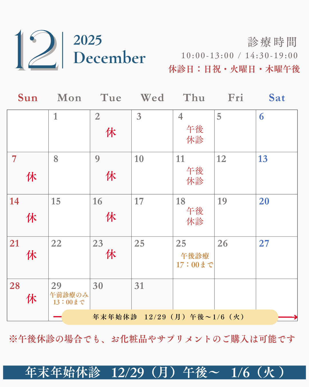 ※▲印は午後休診です。お化粧品やサプリメントのご購入は可能です。