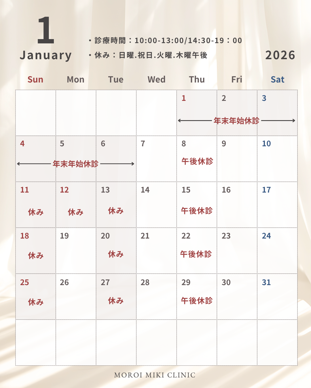 休診期間中にいただいた、WEB予約やお問い合わせにつきましては、1/7(水)以降にご返信させていただきます。