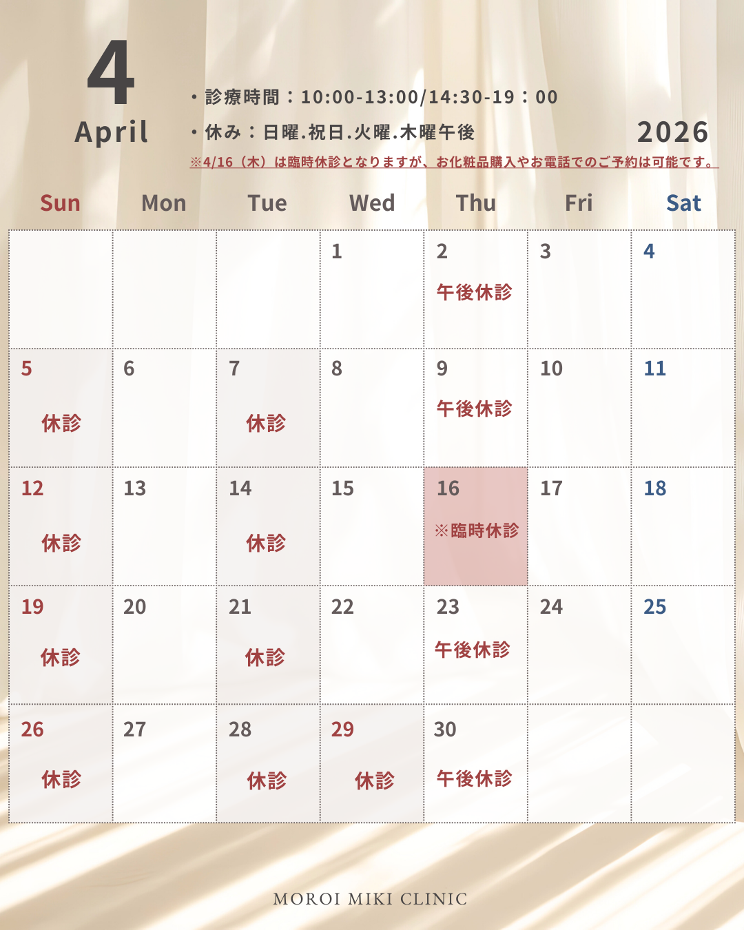 4月の休診日のお知らせです。4月16日(木)は、臨時休診となりますが、お化粧品やサプリメントのご購入、お電話でのご予約は可能です。(診療はしておりません)ご不便おかけいたしますが、ご理解の程よろしくお願いいたします。※午後休診の場合でも、お化粧品やサプリメントのご購入は可能です。