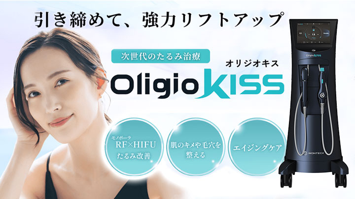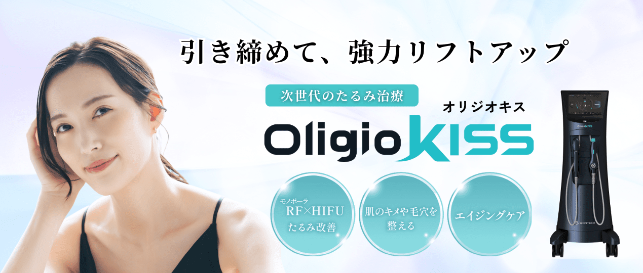 オリジオKISSは、モノポーラRF(高周波)とHIFU(高密度焦点式超音波)を1台に搭載した最新のリフトアップ機器です。RFで肌表面の引き締めとコラーゲン生成を促し、HIFUで土台のSMAS層を強力に引き上げます。進化した冷却システムにより、痛みを抑えながら効率的なたるみ改善が可能です。