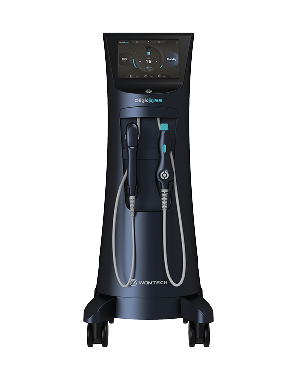 モノポーラRF(高周波)とHIFU(高密度焦点式超音波)の2つのテクノロジーを1台に搭載した最新のリフトアップ機器です。オリジオKISSは、2つのテクノロジーで「内因性」と「外因性」の両方のたるみ原因を解決します 。