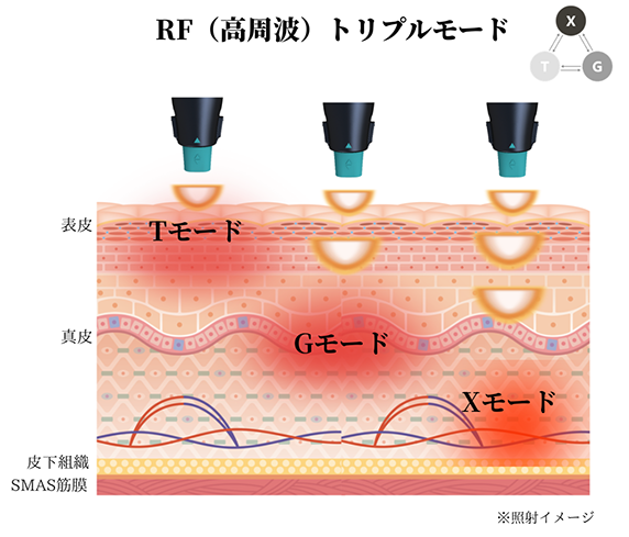 Gモードでは、 浅層(真皮層)へ優しく加熱し、肌の引き締めを促します。